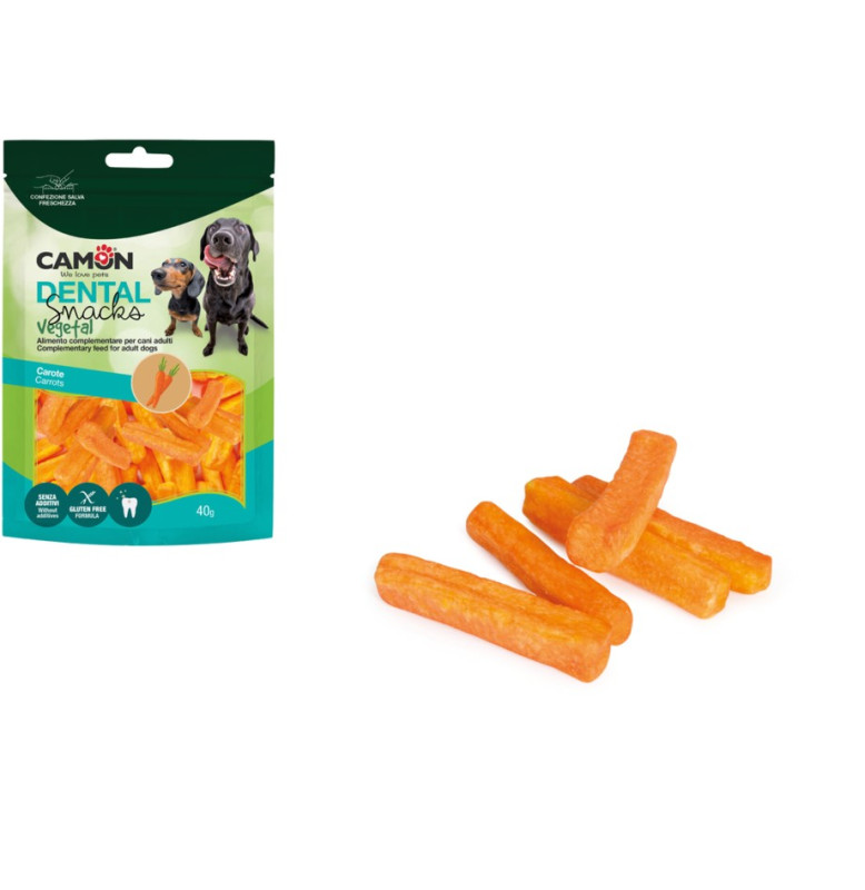 Crunchy carrots, a tasty chewable complementary feed for adult dogs.